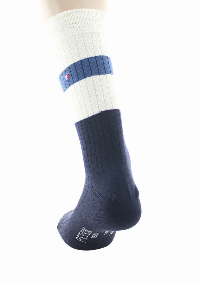 Les chaussettes à côtes pour homme en laine Perrin bleu sont aux motifs de bandes de bleues et blanches associées au tricotage côtelé pour un effet sportif et rétro. Ce mélange donne une allure casual chic, à la fois décontractée et soignée, qui rappelle les codes du sport vintage tout en restant moderne et élégant.