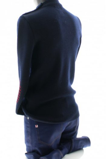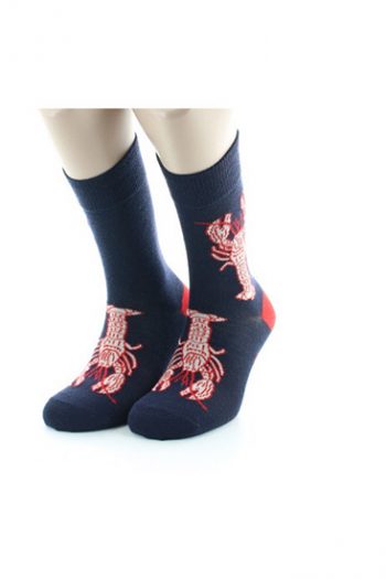 Le modèle fantaisie est asymétrique. Une chaussette a des rayures larges sur la tige et fines sur le pied et inversement sur l’autre. Le fond est marine et les rayures sont kakis.