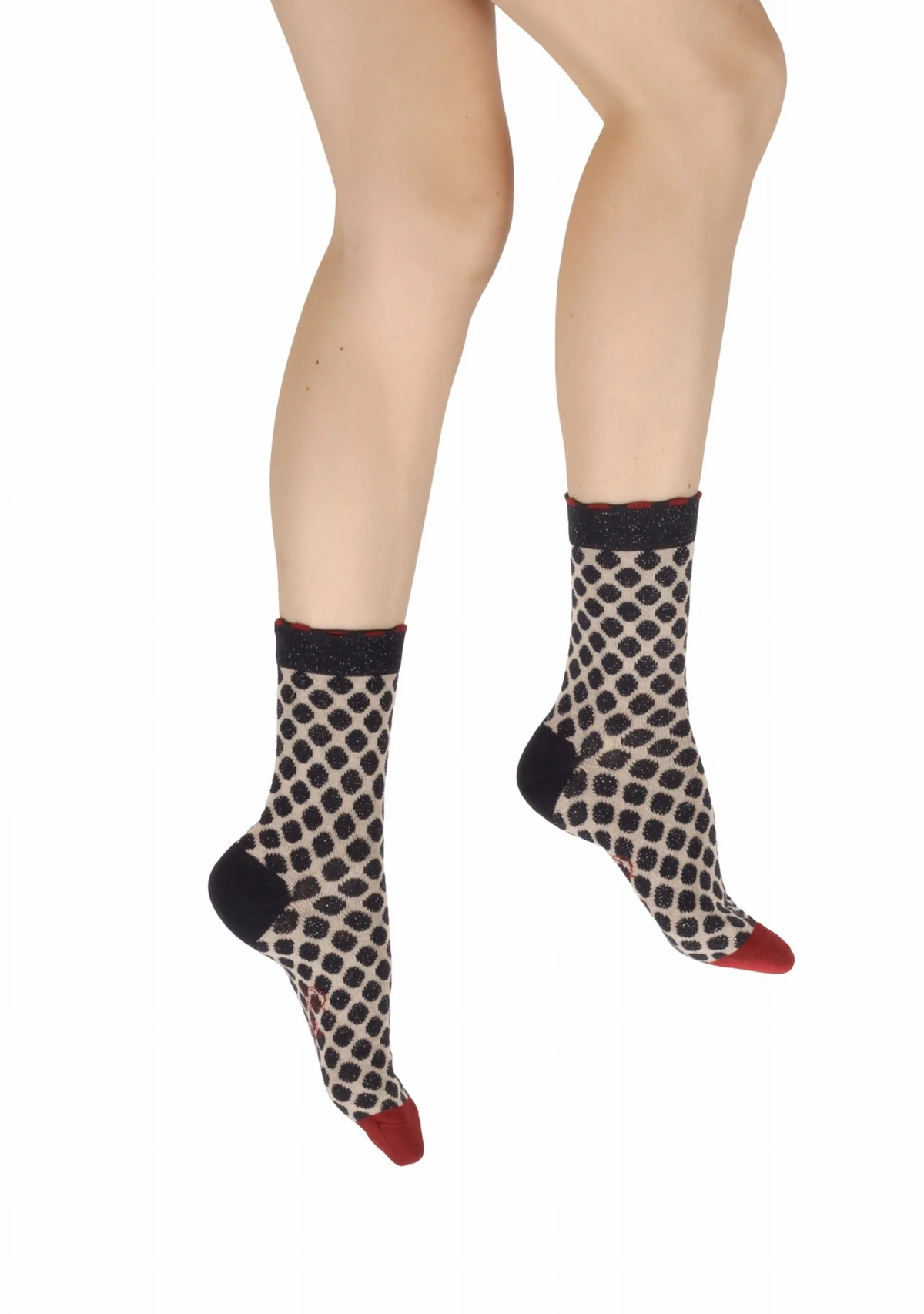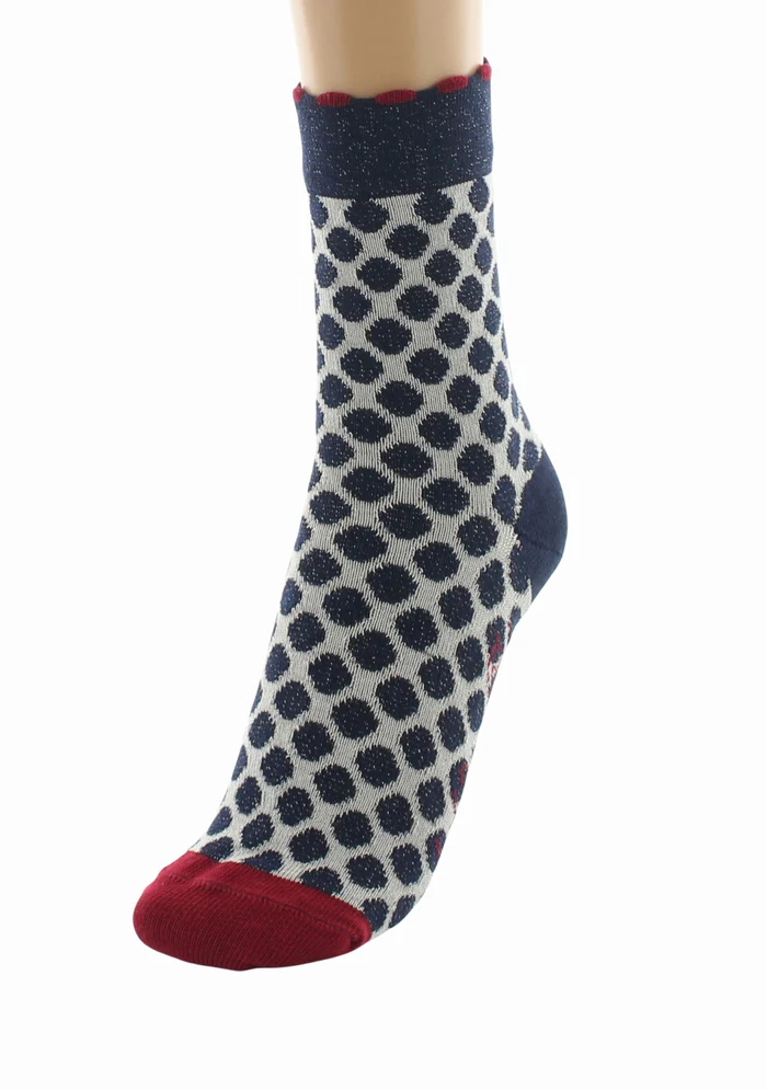 Le modèle de chaussettes courtes Pois bleu lurex est majoritairement tricoté en coton fil d’Ecosse. Une matière légère et résistante, idéale pour l’été. Les talons et les pointes sont renforcés avec un fil supplémentaire pour garantir la durabilité de nos produits.