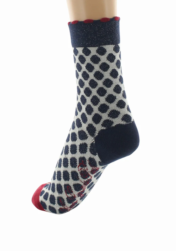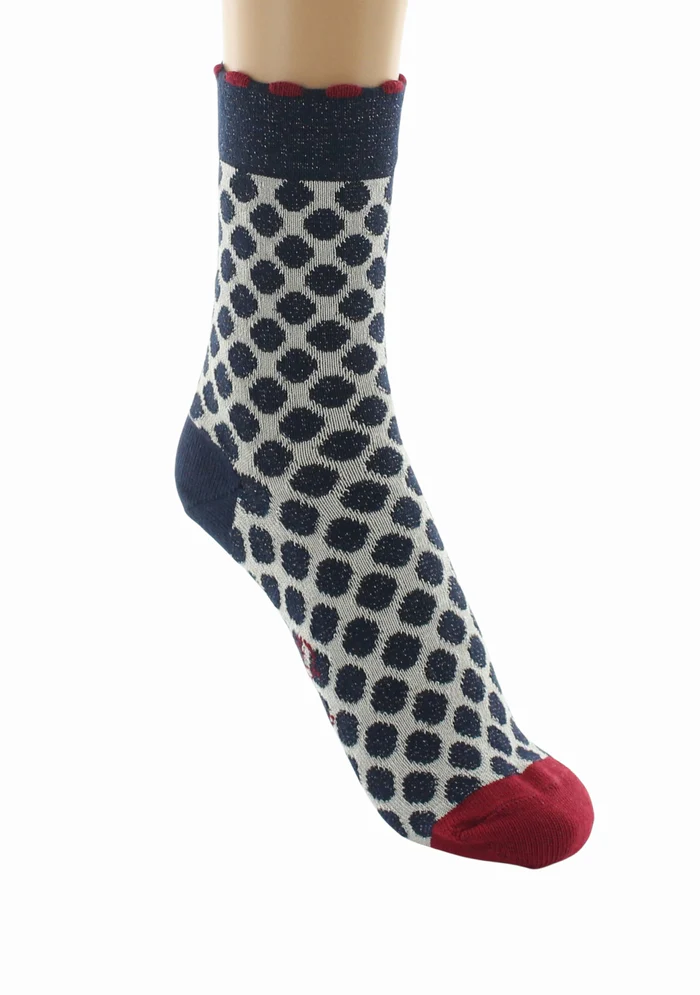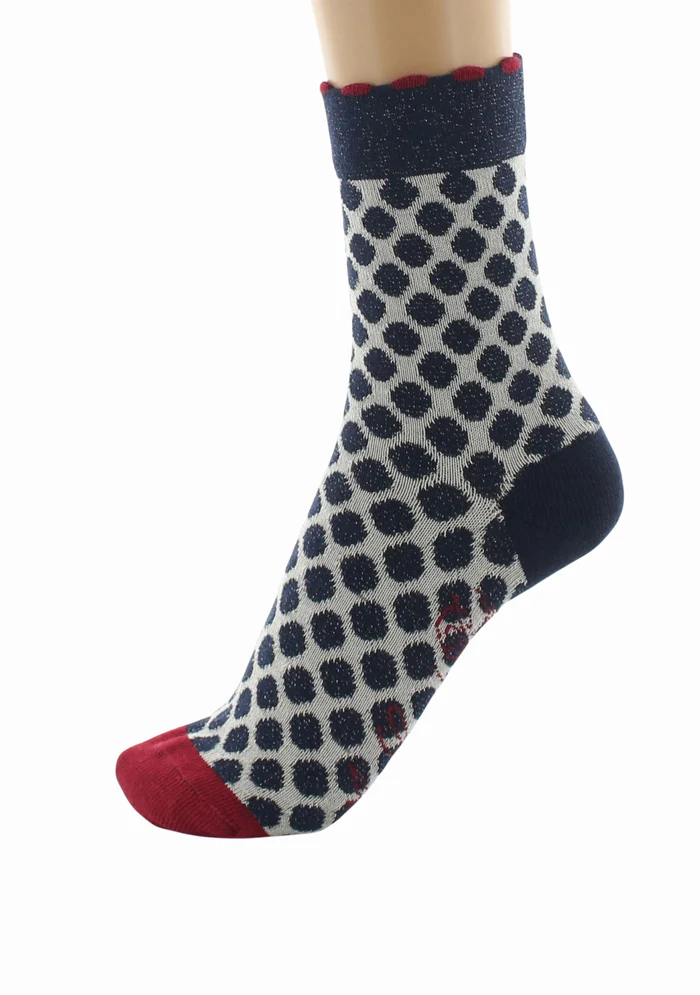 Les pois bleu marine pailletés prennent place sur un fond écru. Le haut de la tige est habillé de point gaufrés rouges. Le motif pois fait parti des modèles iconiques de la marque, un intemporel dont on ne se lasse pas !
