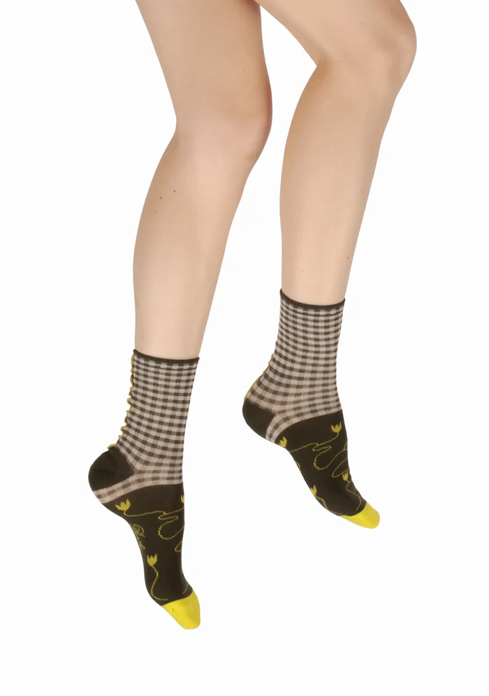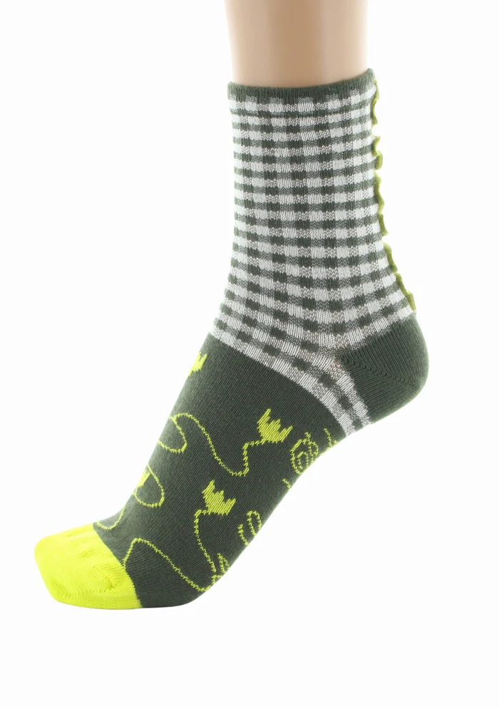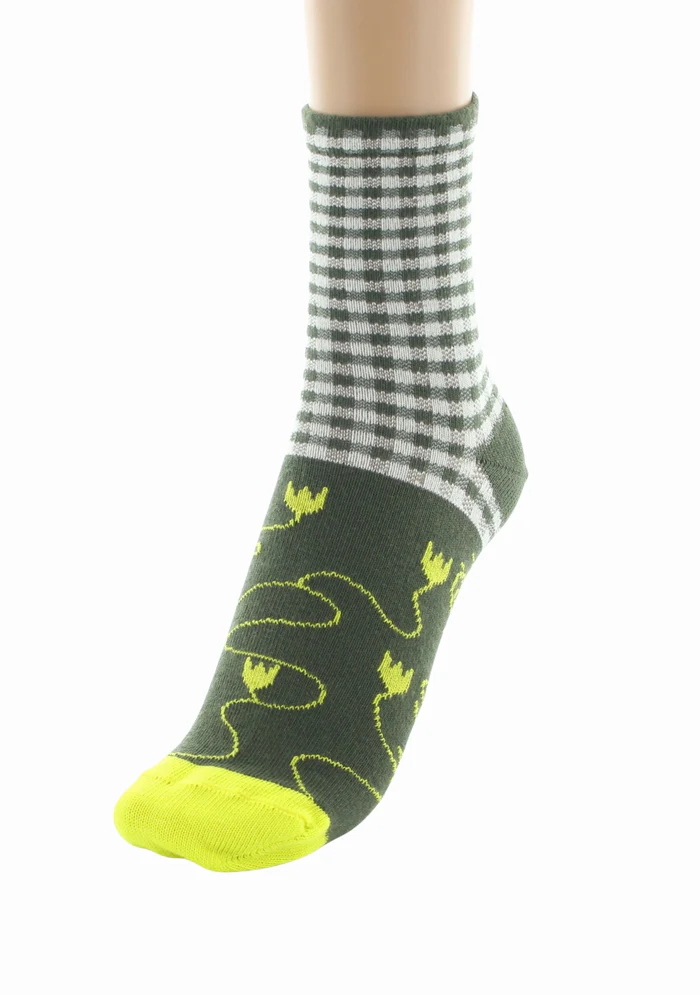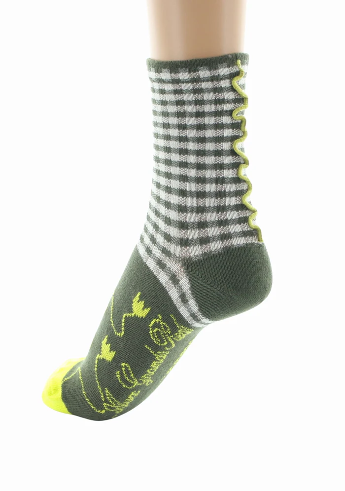 Des chaussettes printanières ayant pour motif un vichy kaki et écru. La pointe est quand à elle aux motifs de fleurs jaune fluos sur un fond kaki qui donne du peps à la paire. Un surjet vert kaki habille l’arrière de la tige pour un look à l’image de Berthe Aux Grands Pieds !
