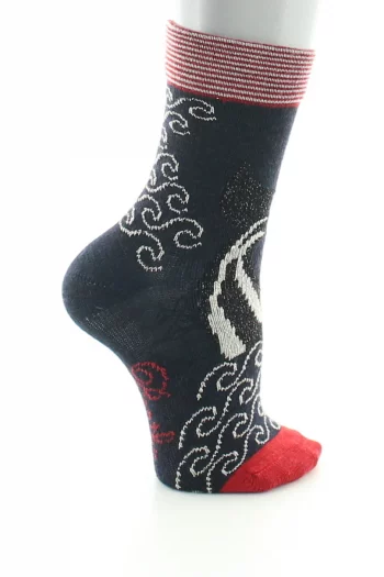 En hommage à La Reine, la marque Berthe vous concocte comme à chaque collection un modèle avec l’élastique en forme de couronne. Sur ce modèle de chaussettes enfant, la couronne est accompagnée de pois bleus placé à l’arrière de la jambe et sur le pied. Des rayures rouges habillent l’ensemble de la chaussette !