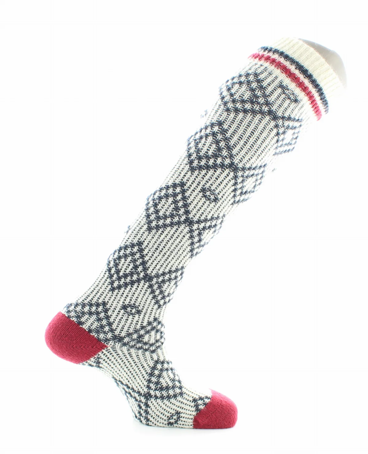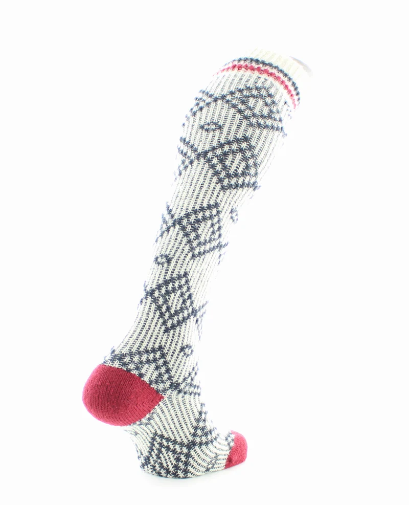 Ce modèle de chaussettes hautes Jacquard en Laine d’alpaga Blanc est fait à grosse jauge créant des mailles très épaisses. Des motifs de jacquard bleu marine sur un fond blanc pour un effet nordique. Existe aussi en mi chaussettes !
