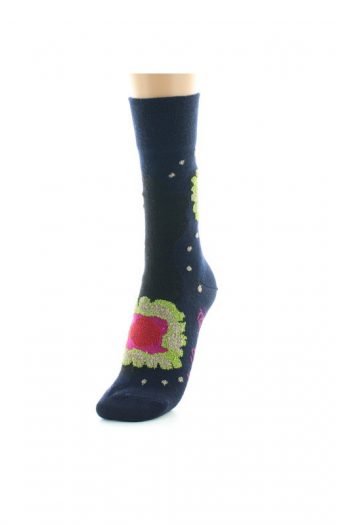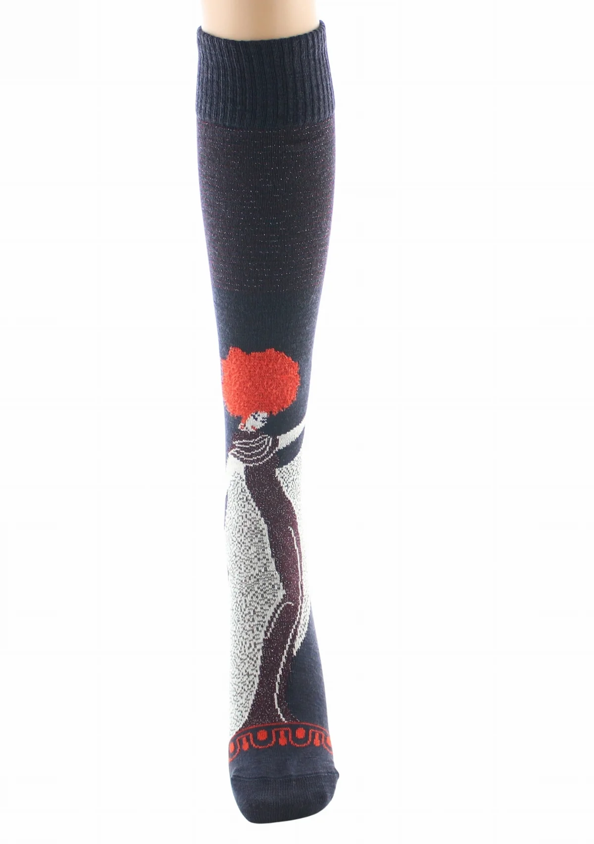 Une femme à la chevelure généreuse tricotée en fil poilu orange ne laisse personne indifférent par sa tenue chic et élégante. Réalisée en laine marine, cette chaussette met en valeur cette femme à la robe longue tricotée en fils couleurs ivoire et lurex bordeaux. . Existe aussi en mi- chaussettes !