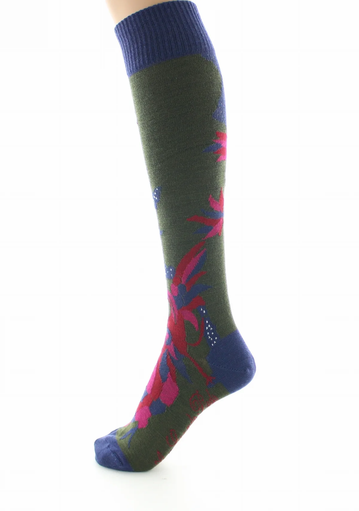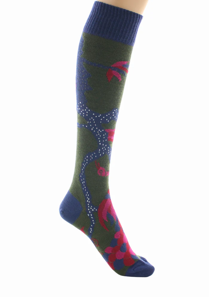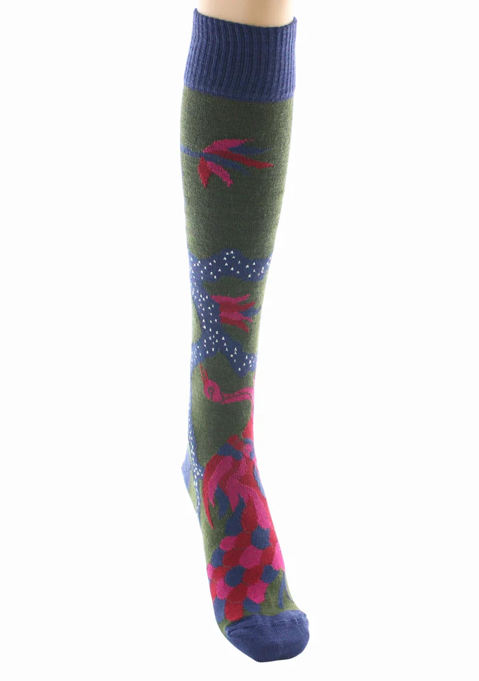 Représentation d’un paon aux plumes colorées. Cette création de chaussettes hautes Le Paon en laine et coton e est remarquable par l’alliance du kaki et du bleu royal associés au rose et rouge Existe aussi en mi- chaussettes !