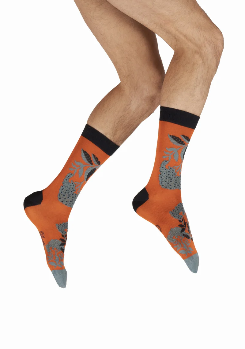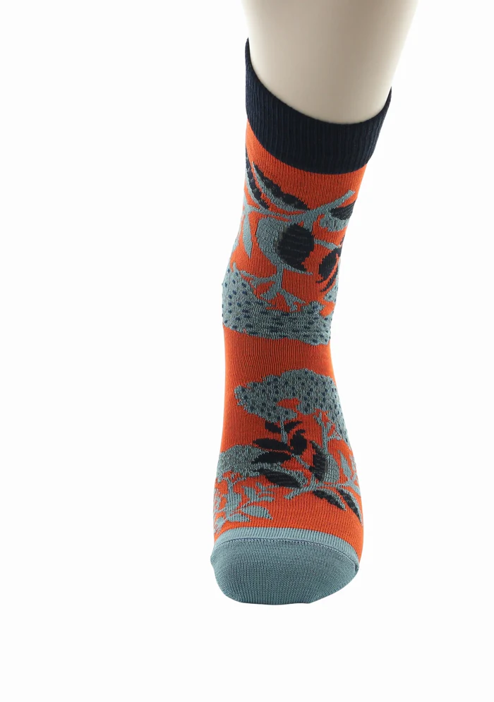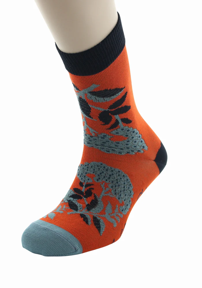 De belles fleurs bleutées au feuillage misent en valeur grâce à ce fil d’Ecosse orange qui l’entoure. Le haut de la tige couleur bleu marine est réversible et ne comprime pas la jambe. Cette création est peps par les tons et délicate parle thème floral.