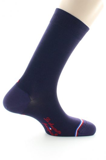 Ces chaussettes sont préformées aux pieds d’un homme. La taille est ajustée à votre pointure, le talon et la pointe sont renforcés d’un fil supplémentaire pour plus de résistance. Le remaillage de la pointe est fait à la main. Une petite cocarde se distingue au-dessus du talon et la pointe est aux couleurs du drapeau français.