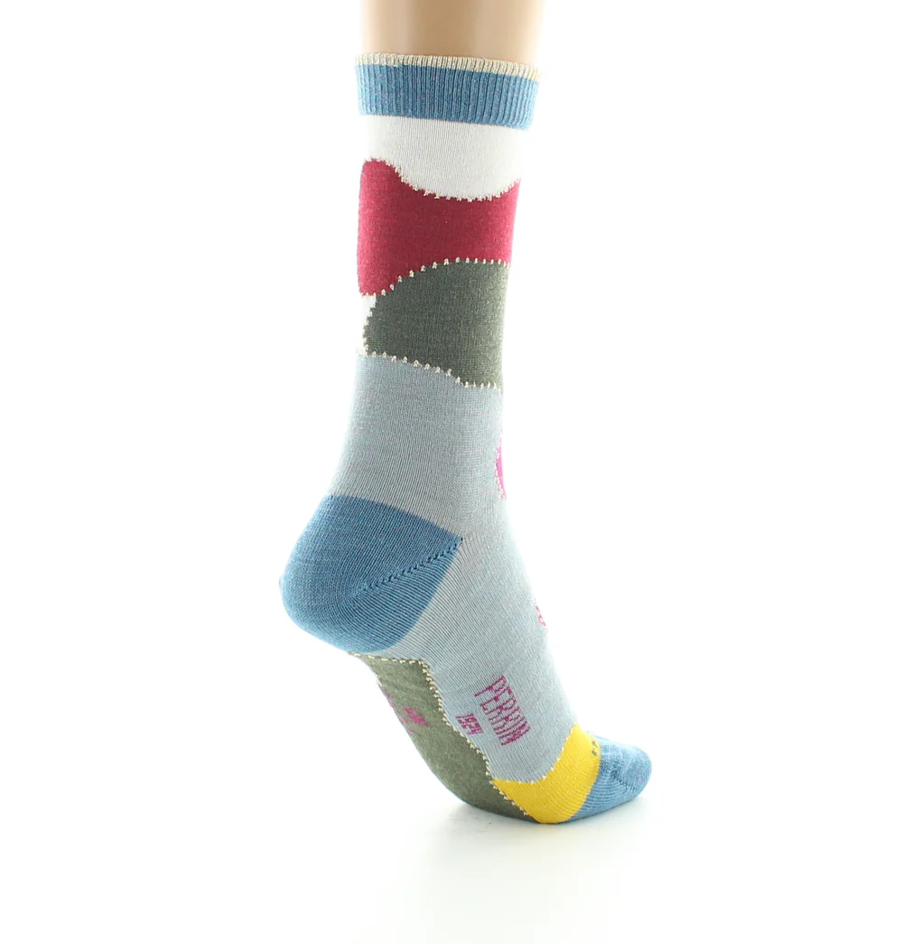Apportez une touche de créativité à vos tenues avec les chaussettes en laine Patchwork multicolore. Leur design original associe harmonieusement des aplats de couleurs contrastées — bleu ciel, rose, vert, rouge et jaune — reliés par des lignes ondulées façon patchwork, pour un rendu à la fois graphique et moderne.