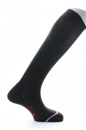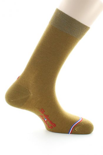 Ces chaussettes sont préformées aux pieds d’un homme. La taille est ajustée à votre pointure, le talon et la pointe sont renforcés d’un fil supplémentaire pour plus de résistance. Le remaillage de la pointe est fait à la main. Une petite cocarde se distingue au-dessus du talon et la pointe est aux couleurs du drapeau français.