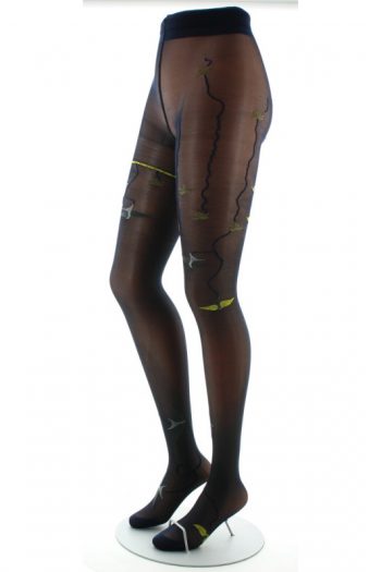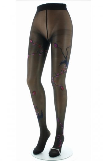 Ces collants 30D de couleur prune et jaune dévoilent de jolie fleurs nommées La Monnaie du Pape. Les motifs sont gris et jaunes. Les motifs grimpent et descendent sur vos jambes . Une création signée Berthe Aux Grands Pieds