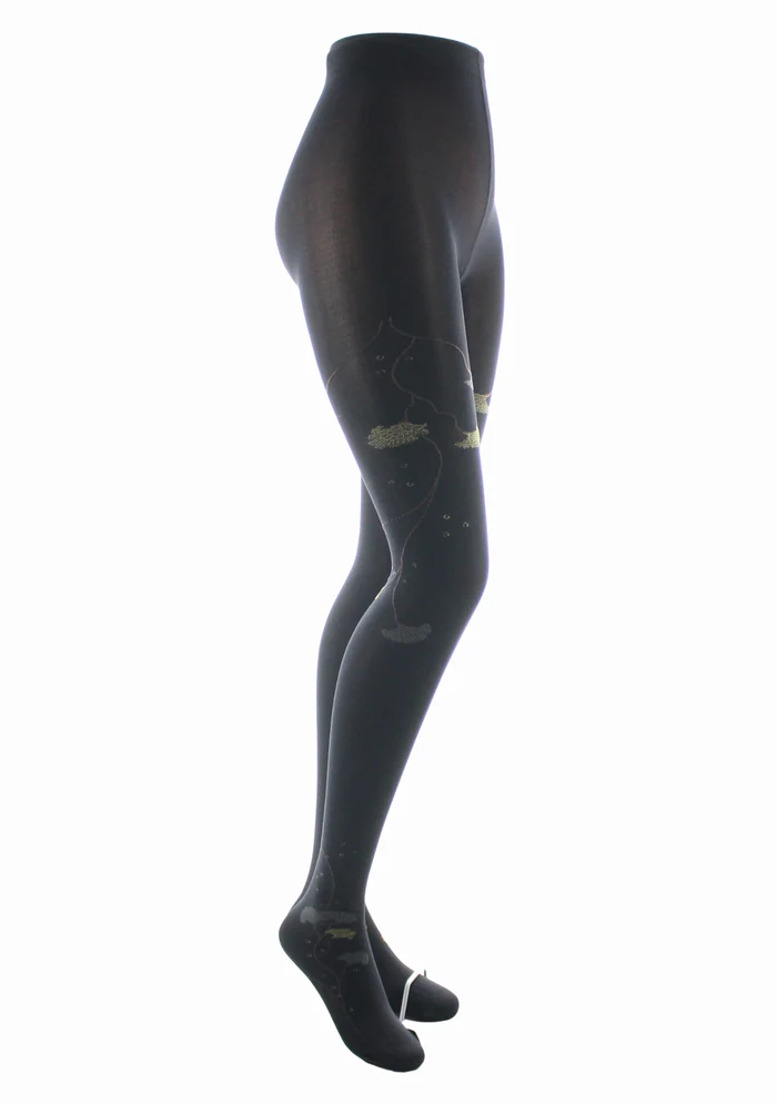 Ces collants 40D ALBIZIA Noir Kaki joue la finesse avec ses branches grises soulignées de petites feuilles kaki. Un motif végétal discret qui apporte une note naturelle et élégante à vos jambes.