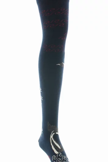 Ces jambières en coton « Le Paon » jouent avec les contrastes. Sur un fond bleu nuit, de larges motifs graphiques rappellent l’ombre des ailes, tandis que des touches rouges et pourpres évoquent des plumes de paon au bas des jambes. Un modèle original qui apporte couleur et caractère à vos tenues. Faites l’ensemble avec les accessoires assortis !