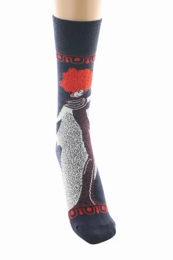 Une femme à la chevelure généreuse tricotée en fil poilu orange ne laisse personne indifférent par sa tenue chic et élégante. Réalisée en laine marine, ces mitaines mettent en valeur cette femme à la robe longue tricotée en fils couleurs ivoire et lurex bordeaux. Existe aussi en version chaussette !