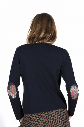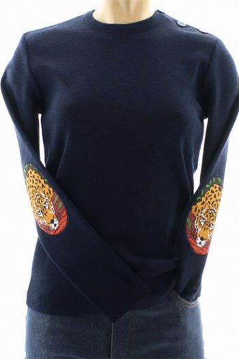 Ce modèle de pull marin femme « Œil » est col rond uni marine avec une boutonnière au niveau du col. Les coudières sont aux motifs de clin d’œil asymétrique !