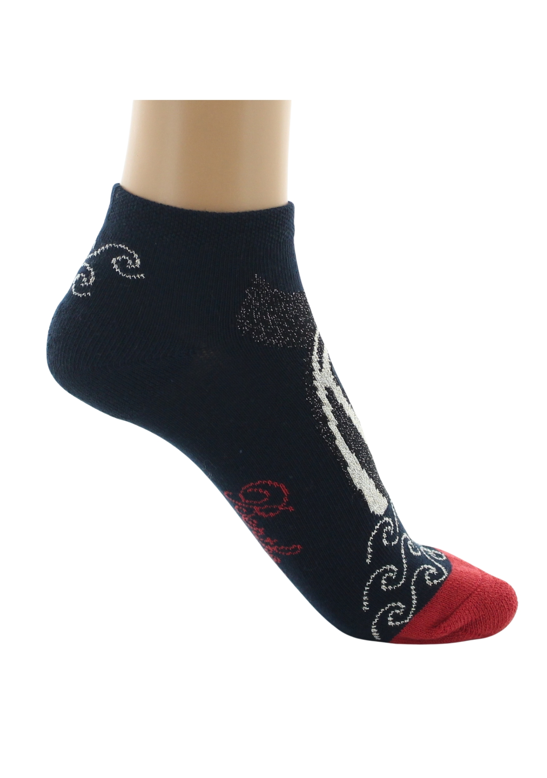 Une majestueuse queue de Baleine noire et blanche brillante prend place au niveau du pied. Le fond bleu marine met en valeur les délicates vagues blanches. L’élastique est lui aussi fantaisie, habillé de fines rayures rouges et blanches. Découvrez toutes les socquettes sport ICI